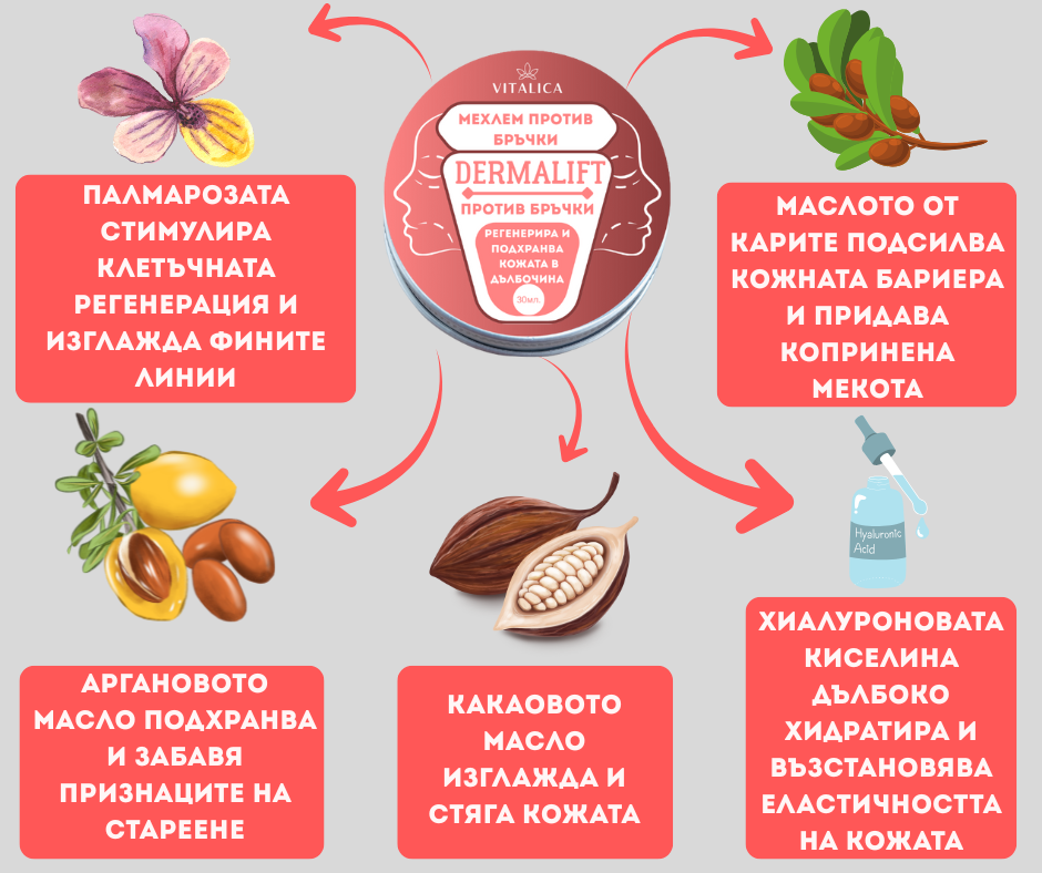 Повечето кремове само прикриват признаците на стареене. Нашият мехлем е с разработена формула, така че да подхранва в дълбочина, стимулира естественото обновяване на клетките и спира образуването на нови бръчки.