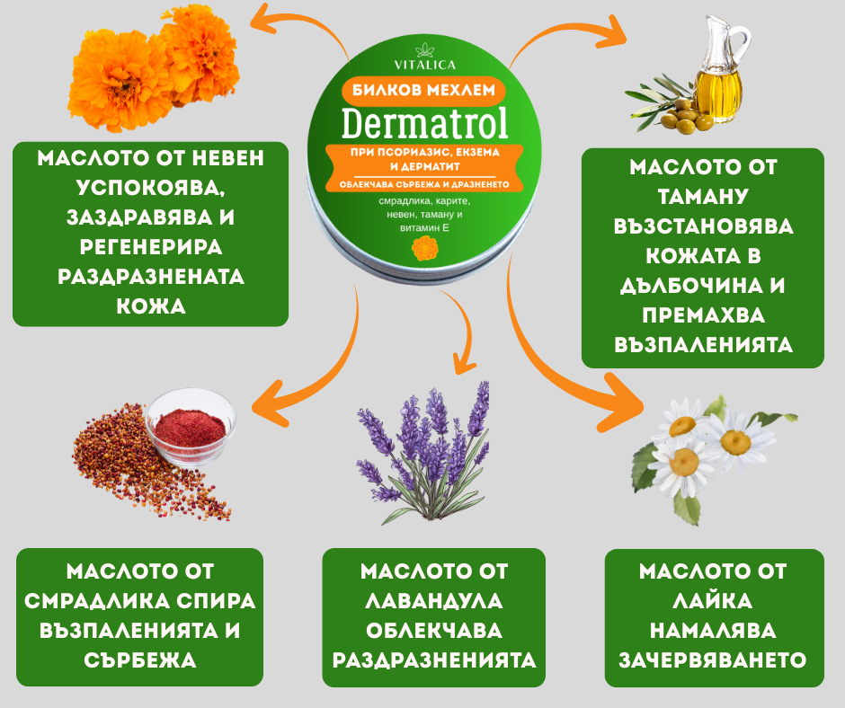 Не. Dermatrol съдържа само натурални съставки и е подходящ за чувствителна кожа. Ако имаш алергия към някоя от билките – направи тест на малък участък.