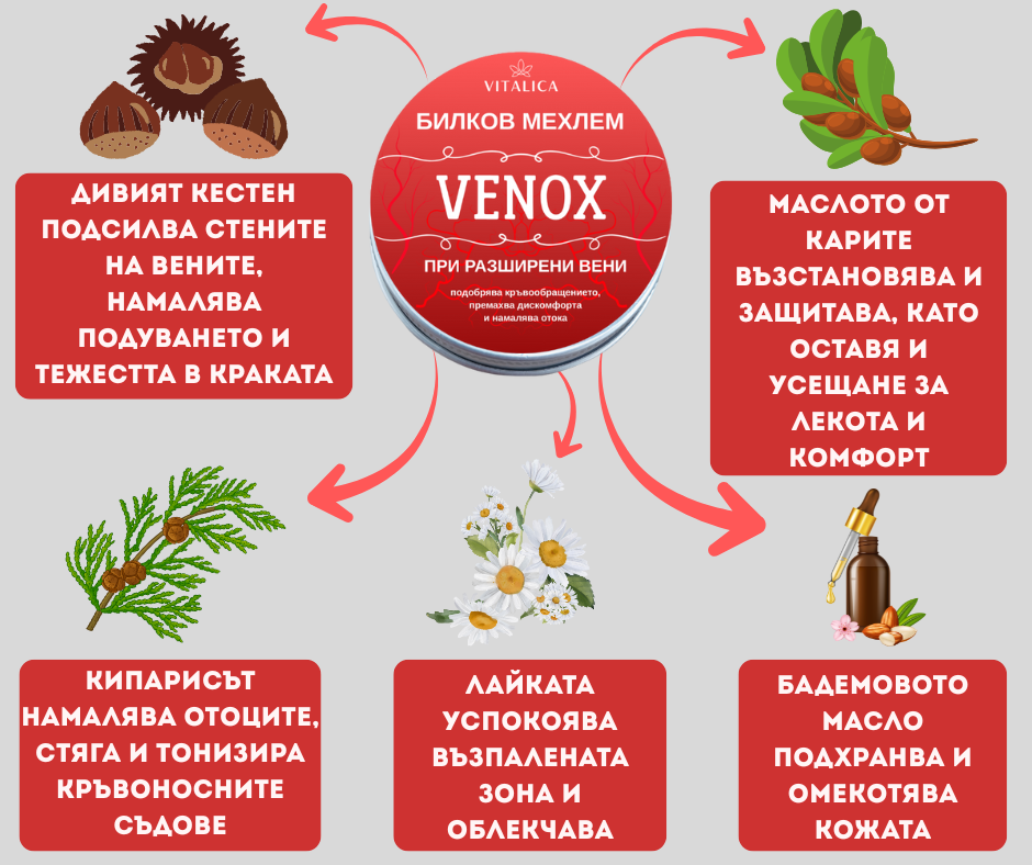 Венозният тонус се подобрява. Отоците видимо намаляват, а усещането за подуване и парене се появява все по-рядко. Кожата около проблемните зони е по-еластична и с по-добро кръвообращение.
